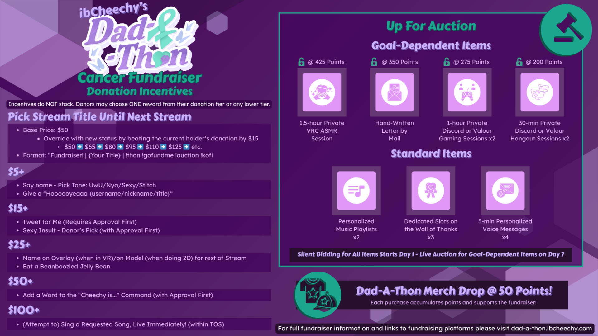 This fundraiser operates in accordance with the policies and terms of service of any third-party platforms used in connection with the Dad-A-Thon event, including but not limited to Twitch, Ko-fi, Fourthwall, GoFundMe, AirAuctioneer, Discord, Root and related payment processors.All participants agree to comply with the applicable terms of those platforms.