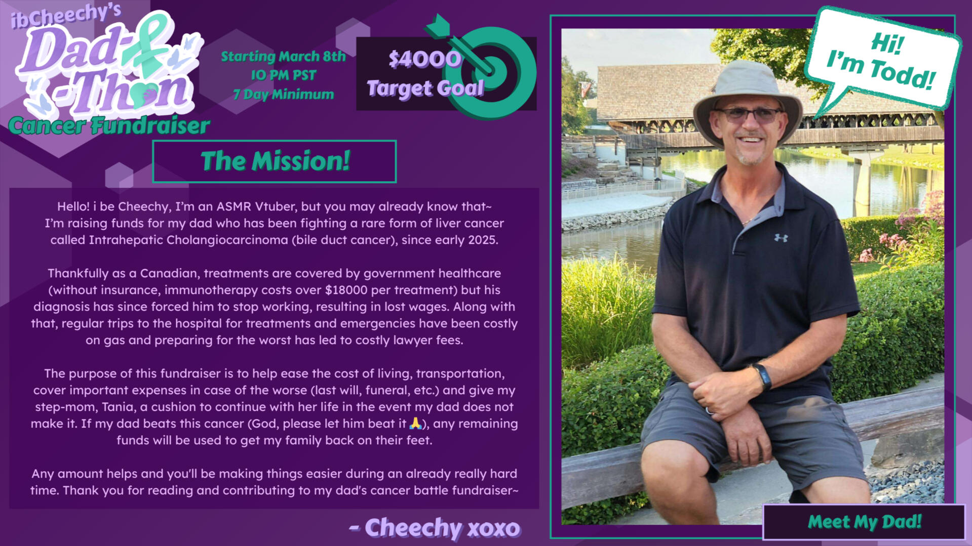 Hello, i be Cheechy and I'm raising funds for my dad, Todd, who has been fighting cancer since early 2025. I love my dad so much and the thought of losing him hurts even more. I can't imagine the pain him and my step-mom, Tania, must be going through with this battle and I want to provide support in some way. So here we are, a whole fundraiser dedicated to him~This is the Official Hub for the Fundraiser, where you can learn more about my dad, navigate to related fundraiser platforms and get all the information about the Stream-A-Thon taking place on Twitch.Thank you so much for your interest and contributions to the fundraiser. Every little bit helps and your support means the world to me and my Dad. Let's make this a successful fundraiser, together!