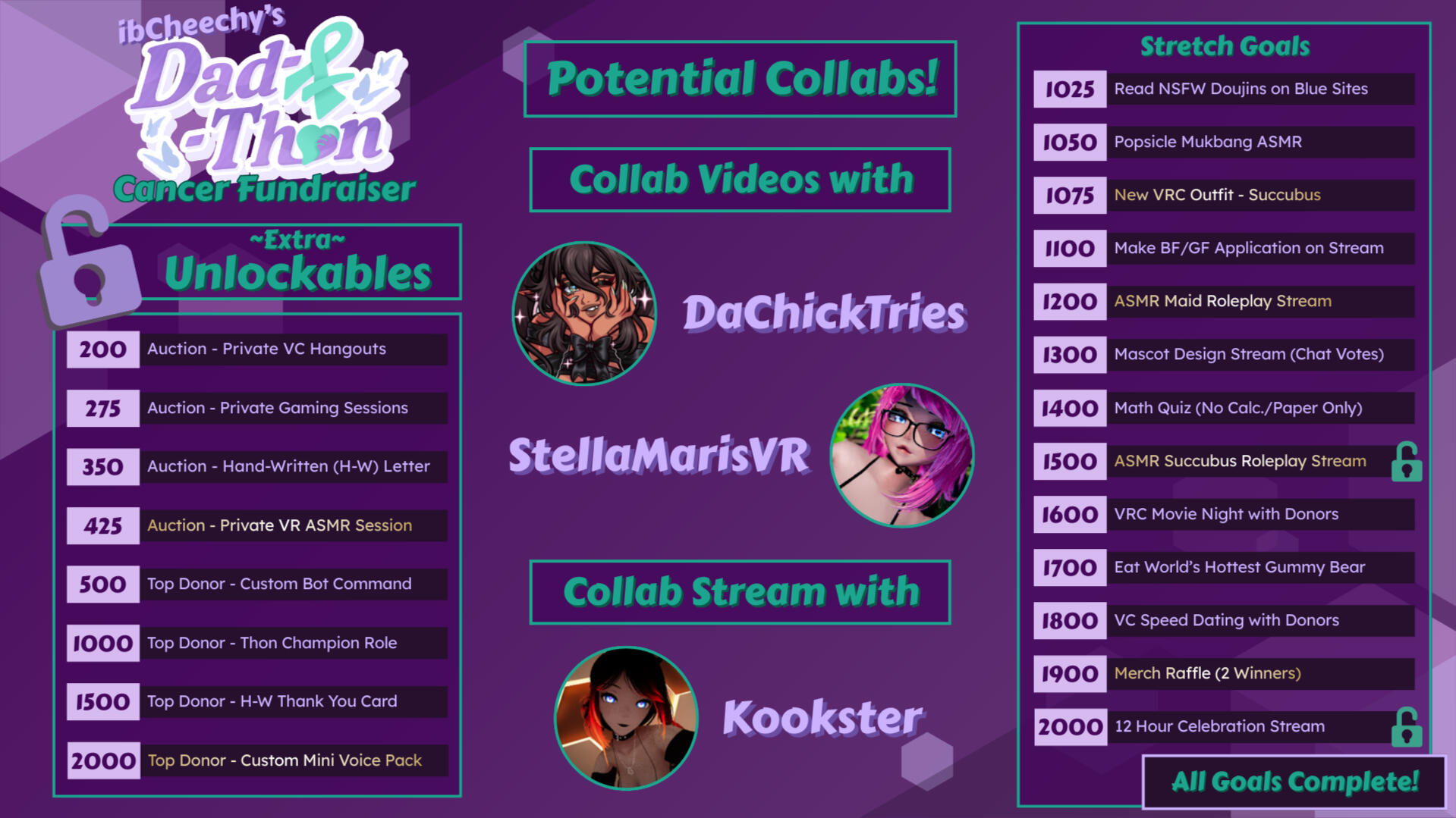 - 1 Twitch Goal Point is awarded for each $5 donated through Ko-fi or GoFundMe- Goal Point totals are tracked publicly during the event.